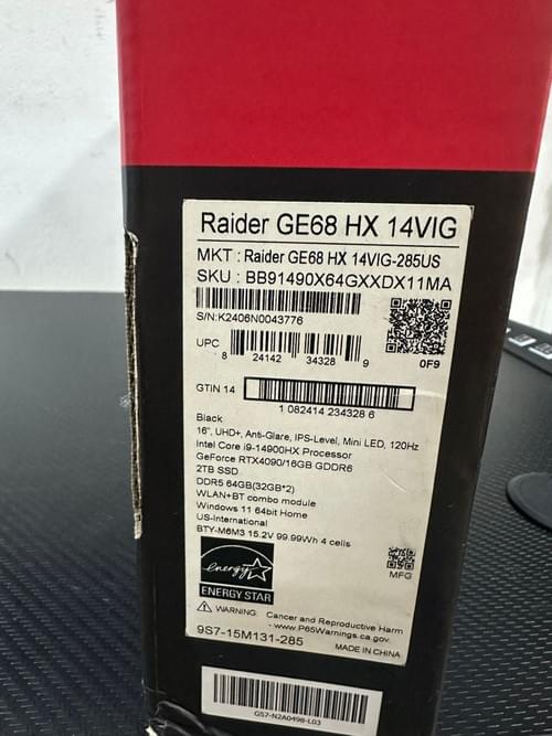 BrandNew openedbox msi Raider GE68HX: Intel Core i9-14900HX, 32GB DDR5 Ram , 2TB NVMe SSD, 16GB Dedicated NVIDIA Geforce RTX 4090 Graphics , 16” 120Hz MiniLED UHD+ Display, Thunderbolt 4, Cooler Boost 5, Win 11 Home: Black